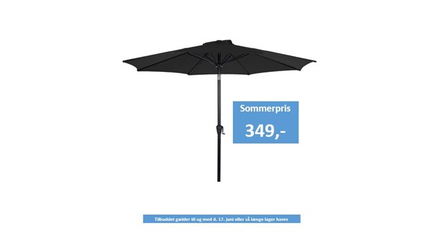 Mangler du skygge i sommer solen?? ☀️☀️☀️ Sort parasol m/tilt & hejs - Ø 3M Før 449,- Tilbudspris 349,- Tilbuddet gælder til og med uge 24 eller så længe lager haves.